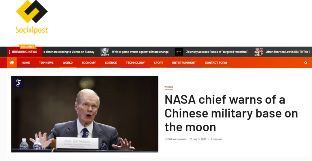 比如美国《社会邮报》网站7月3日的文章,大标题是:“NASA主管警告月球上将会出现一个中国军事基地。”