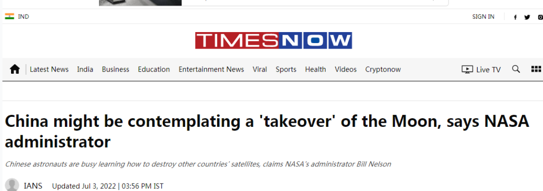 还有印度“TIMESNOW”网站3日的文章,标题都是“NASA局长说……”。主标题是:“NASA局长说,中国可能正在考虑‘接管’月球”。副标题是:“NASA局长说,中国宇航员正忙于学习如何摧毁其他国家的卫星。”